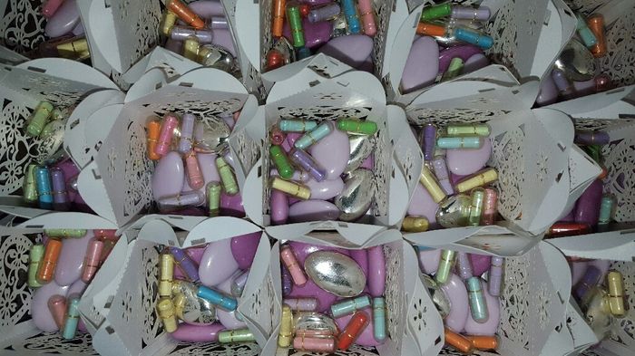 voilà mon petit mélange pour mes boîtes à dragées. plus de 400 pilules du bonheur à ouvrir pour y inscrire des petits mots doux. heureusement que j'ai pas 100 personnes à mon mariage hi hi.