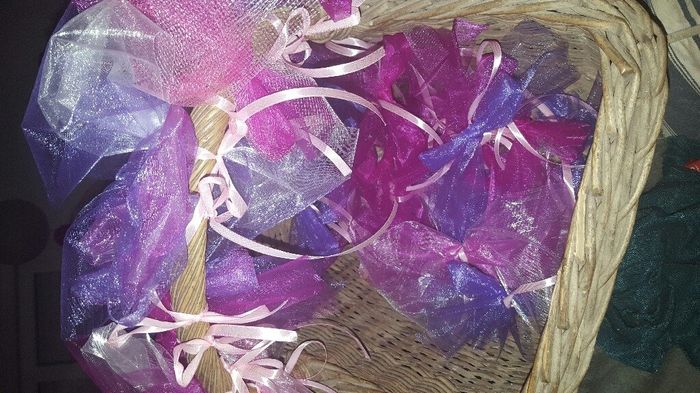 Avec chéri on a commencé à faire les noeuds pour les voitures aujourd'hui. On en fait une cinquantaine et on doit en faire 200 -_- c'est loooong!!! Et on a également fini de mettre le ruban sur les sachets cousus par une amie. On y mettra les...