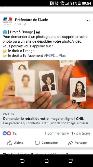 Bonjour à tous Je viens de tomber sur un article intéressant. Je me souviens Avoir vue un piste d'une mariée qui avait un souci avec son photographe qui avait publier leurs photos sans accord. Peut être qu'il serait bien de connaître nos droit...