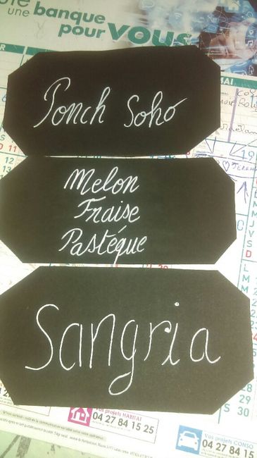 Bonsoir Je voulais juste vous montrer mes avancées du soir : - panneaux des jeux extérieur pour le vin d'honneur - panneaux directionnel - étiquette vin d'honneur - étiquette des bonbonnieres du vin d'honneur Voilà pas grand chose mais je suis...