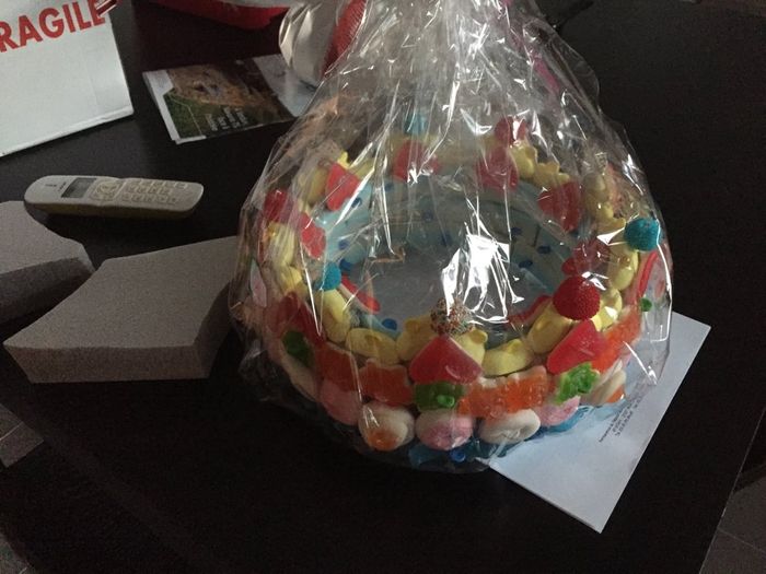 Voila jai reçu la couronne de bonbons pour le centre de table des enfants. Je vais mèttre au milieu un socle a ballons comme sur la photo àvec les ballons aux couleurs du mariage donc rose et gris.Ils auront également des livrets de jeux, crayons,...