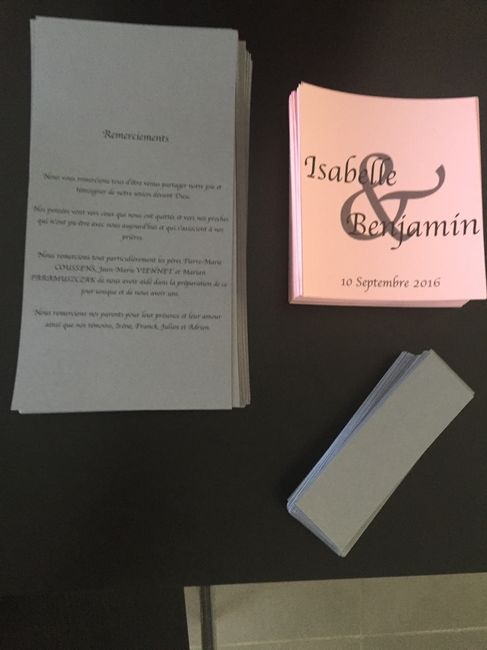 A J-30 Ca y est les 1000 feuilles sont imprimées, découpées. Les petits rubans sont découpés aussi. Reste plus qu'à assembler les 100 livrets. Le plus dur a été fait donc ça va aller vite je pense.