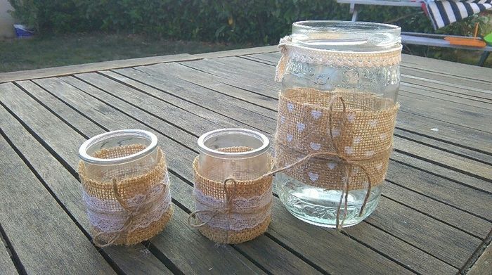 Slt! Alors enfin on avance! Voici notre premier diy d'y week-end dernier! Décoration des photophores et des vases pour les centres de table! Les photophores sont finiesil devrait y en avoir assez (2par table), mais les centres de table il fait encore...