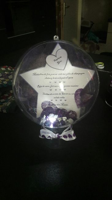 Coucou la commu!!!!J'ai commencé mes menus pour mon mariage "des étoiles plein les yeux". L'idée serait que les boules soient suspendues en l'air, en descendant du plafond par exemple avec un fil de nylon transparent!! Il reste aussi à mettre une...