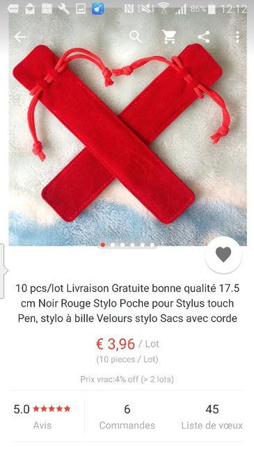 Voilà je viens de recevoir les stylos pour mes invités femmes....En 15 jours et conforme aux photos Je suis trop contente....J attends de recevoir les décapsuleur porte clefs pour les hommes et les pochettes cadeaux...Je suis à 115 jours du mariage ...