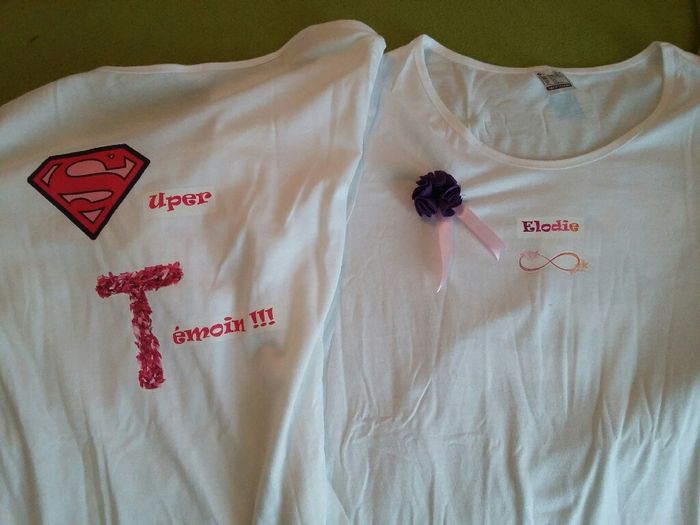 Pour mes témoins "super témoin" au dos. le prénom le signe de l'infini devant avec une fleur en tissu. En bleu pour les hommes de face Et en dernier pour le lendemain du mariage ! Devant un badge "2oui pour un nom" En anglais "fraîchement marié avec...