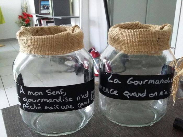 Voilà un pot de pâte à tartiner connue de toutes gourmandes une chute de toile de jute et le tour est joué voilà deux pot à remplir de bonbons pour la table du buffet en déco ; -)