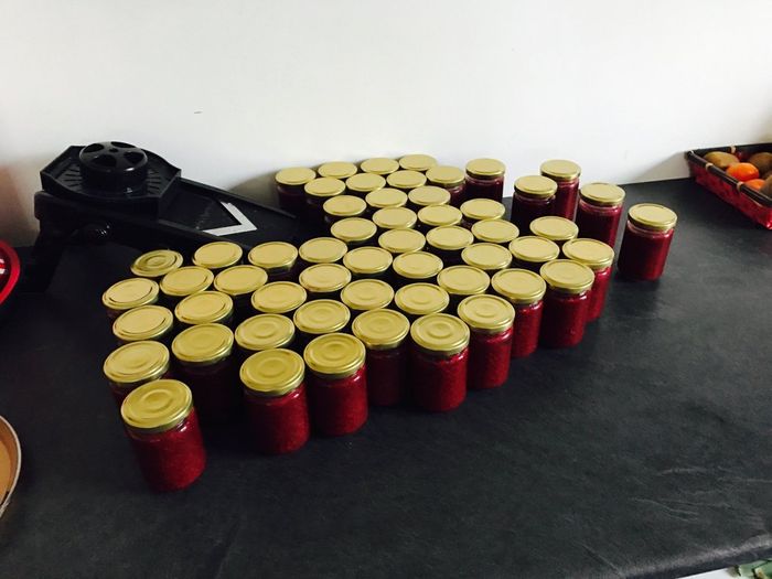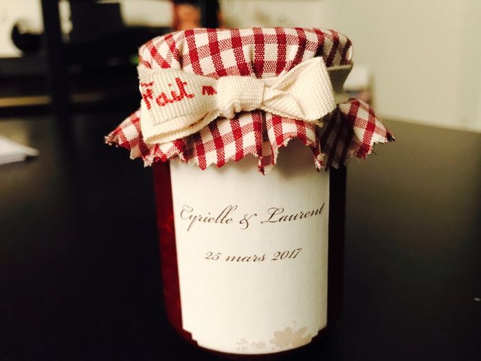 Bonjour à toutes et tous,Hier c'était opération confiture avec mon papa pour la réalisation des cadeaux de nos invités. Une confiture 100% framboises ! 55 pots plus tard (un par couple) il nous reste à faire les étiquettes et à couper le tissu. Nous...