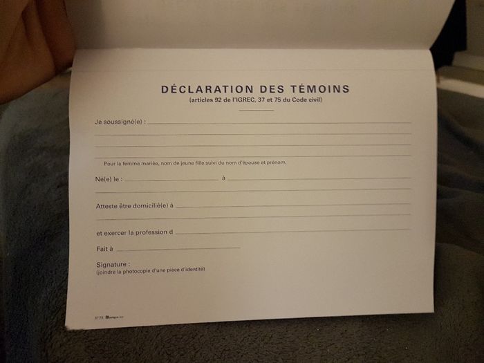 Bonsoir nous somme entrain de remplir le cahier de mariage il y a ceci dedans je me demande si c'est au témoin eux même de le remplir ou non? Car pas facile de les réunir juste pour sa