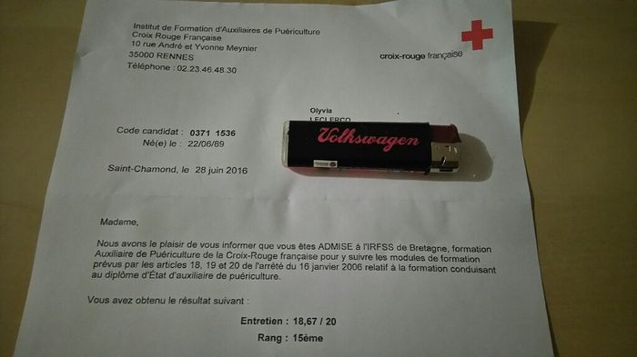 Bonsoir à vous, Bon rien à voir avec le mariage mais je voulais partager ma joie avec vous ! En début d'année j'ai postulé pour une formation d'auxiliaire de puériculture, 5 mois de formation car je suis déjà aide soignante et j'ai eu le résultat...