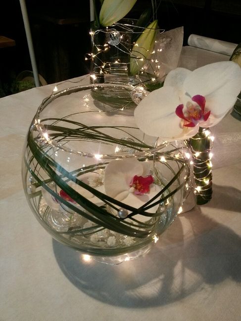 Cet essai confirme mon choix je ne voulais pas la même composition sur toutes mes tables et voici le résultat les guirlandes seront sur toute les compositions. On a fait avec et sans pour tester. Le lys doit s ouvrir. Bise les futurs et les déjà ...