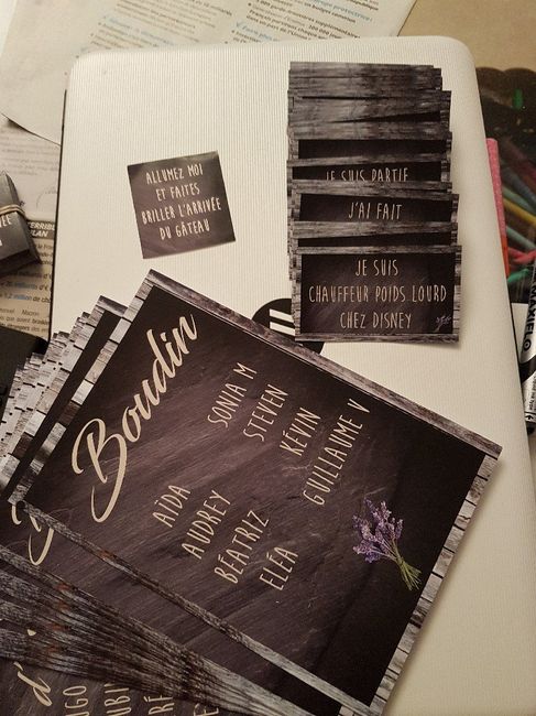 Mon pere a ouvert son entreprise de reprographie il y a quelques mois et a accepté de s'occuper de nos impressions. Et voila! Tout est fait! Le jeu du vin d'honneur, le plan de table, les etiquettes pour les cierges magiques.Bref! Au top! (Isa si tu...