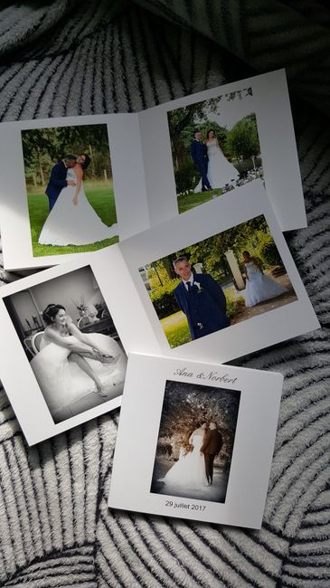Comme dit dans le titre, j'ai reçu mes remerciements (15x15 cm) et les minis livres avec 18 photos (12,5x12,5 cm) que j'ai demandé à ma super photographe pour offrir à nos témoins et mamies Trop contente !!! remerciements minis livres