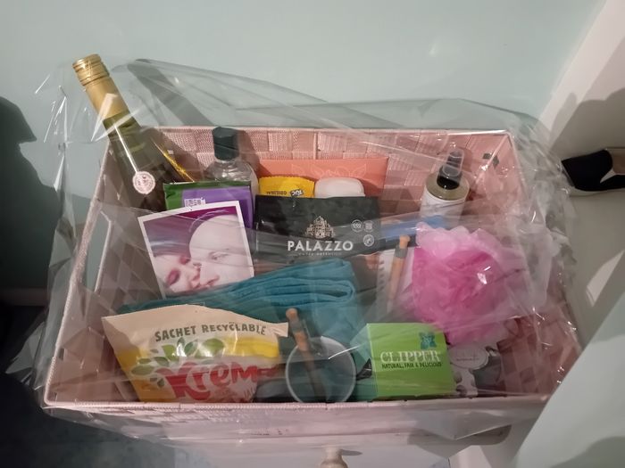Voici le panier garni qui remplaceras le jeu de la jarretière . Satisfaite . Si sa peux donner des idées a d'autres . ❤️