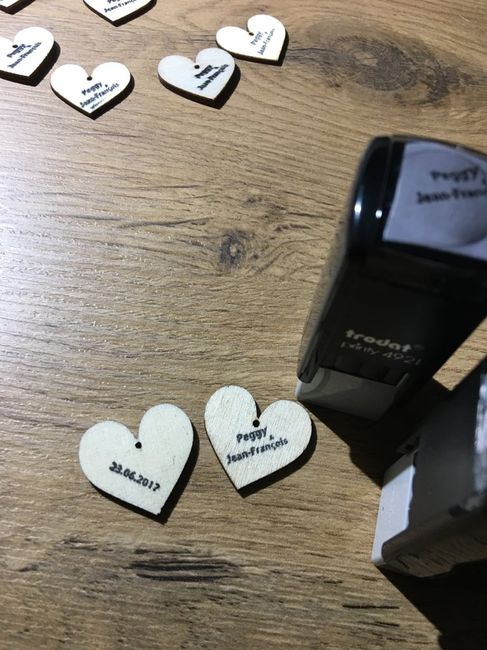 Ce soir je tamponne mes petits coeurs en bois qui accueilleront une ficelle qui servira à nouer nos contenants à dragées !!!