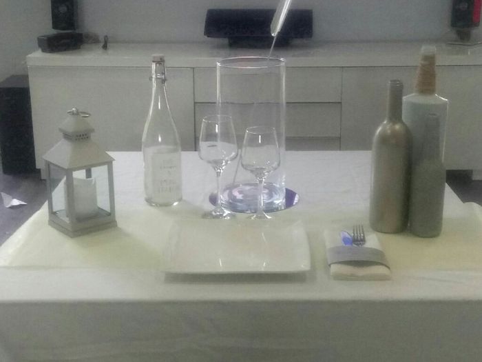 voila l'essai de nos tables. il manque linterieur du vase ou il y aura de leau du sable et un poisson jaune ainsi que des fleurs jaune dans les bouteilles... c'est assez sobre car il y aura beaucoup de pompoms et guirlande lumineuse dans les...