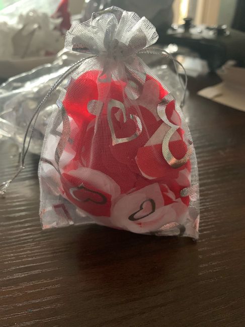 Commencement de l’Atelier confettis sa prend du temps heureusement que je commence petit à petit car il faut remplir plus de 100 sacs accessoires utilisés : - papiers de soies blanc et rouge - ciseaux - carton pour support en coeur