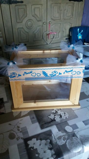 Voici mon urne terminée. C'est l urne qui a servi au mariage de ma témoin. C'est son frère qui l avait fabriqué. Moi j y ai juste mis ma touche perso. Ruban vive les mariés et j ai fais des fleurs en tulle avec des mini rose ourlée. Contente du...