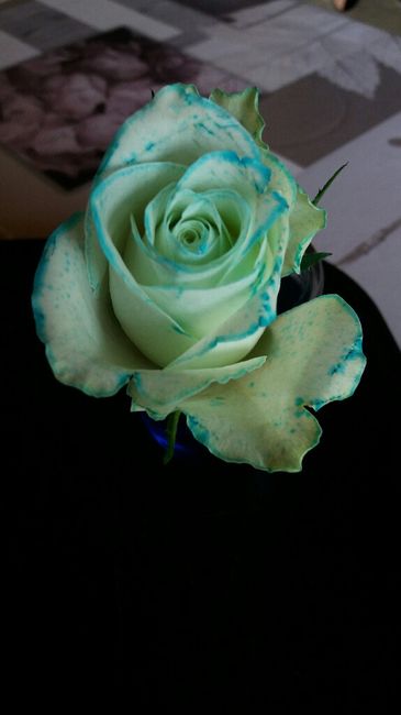 Le voilà à essayer de teinter des roses blanches en bleu. 1er essai dans du colorant alimentaire. La rose y est depuis 15h00. Juste les bords des pétales sont devenues bleu. 2ème test. Je viens de plonger 1rose par la tige et une rose par la fleur...