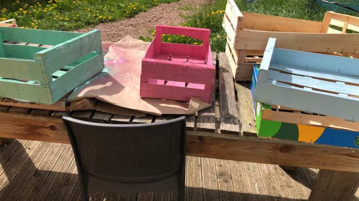 Champêtre mais pas comme tout le monde, champêtre pep’s. Des cagettes pour le côté champêtre, pour mettre les mignardises du vin d’honneur. Ainsi qu’une cagette pour mettre le pain sur le buffet plat. Sûrement une pour faire de la hauteur avec le...