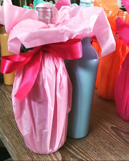 A 25 jours du mariage, il faut que je me remette dedans !!! Les 2 types de bouteilles sont associées. Sera ajouter sur l’une d’elles une bougie. Puis il y aura un bocal transparent, plus petit, avec la composition florale !