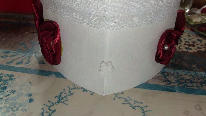 Aujourd'hui j'ai fini mon urne Je suis plutôt contente du résultat même si je sais qu'elle n'est pas parfaite lol Je n'ai pas mis la date volontairement et je mettrais une pancarte "merci" à coté. Voici les photos : Vue du haut Vue de coté 1 Vue...