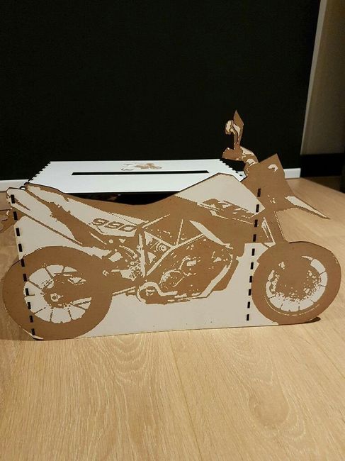 Bonjour a toute notre mariage est sur le theme de la moto voici notre urne dont nous somme fier mais elle n es pas totalement fini et le dessin que nous aurons sur le faire part .