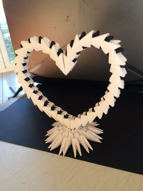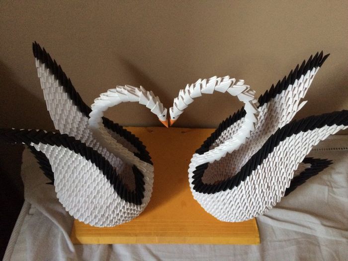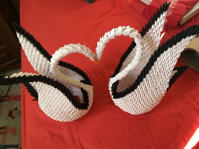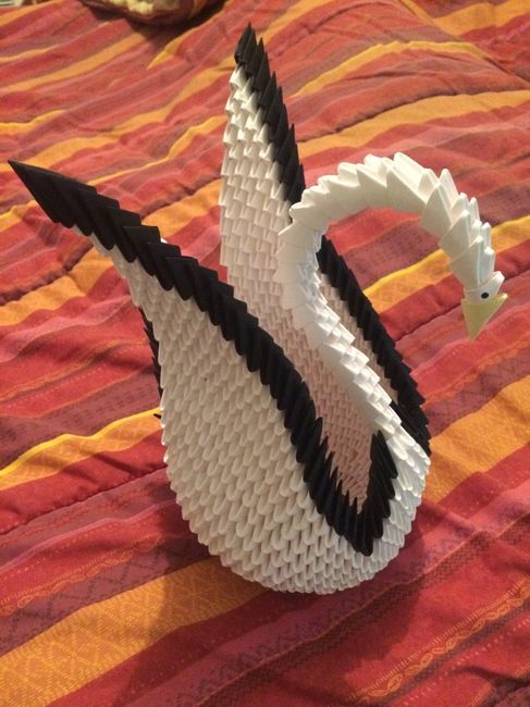 Coucou tout le monde après des heures et des heures de pliage de papier ... voici mon cygne en origami 3 D .... bon le bec va changer mais pour l'instant jai pas de orange... je vais en faire un deuxième pour mettre en face de celui la et que sa...