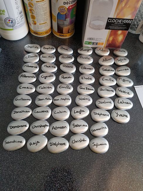 Il y a 3180 joursHello. J'avance à grand pas. Marques-places fait cette après-midi. Ce sont des galets de couleurs argenté, et vous pouvez les trouver sur le site "Décorationdemariage.fr". Ils ne sont pas trop excessifs donc ça va. Pour la table d'honneur j'ai prévu...