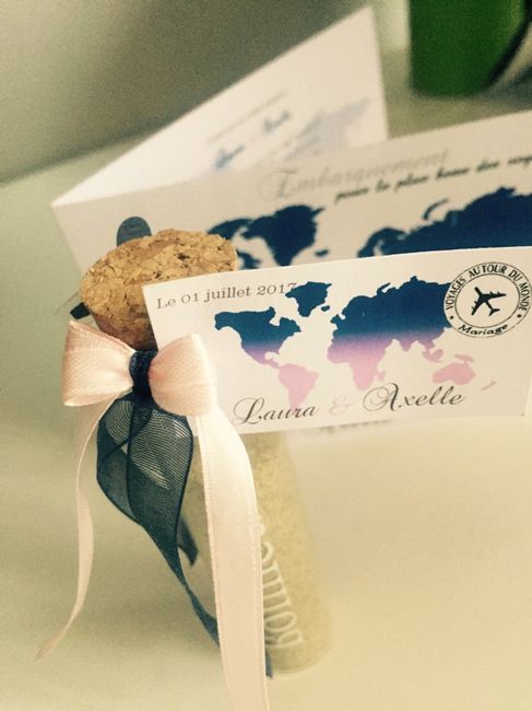 Bonjour tout le monde 🌎 Et oui, nous nous marions sur le theme du voyage !Voici le cadeau que nous remettons aux invités sur le theme du voyage ...Nos couleurs sont rose pale, bleu marine et blanc ...Qu'en pensez vous ?!Une fiole Bonheur, du sable...