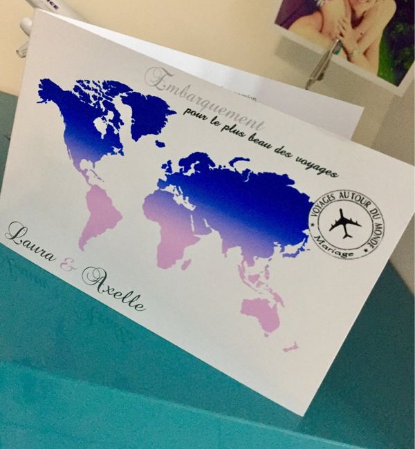 Bonjour tout le monde 🌎 Le voici, le Voila : notre faire part sur le theme du voyage ... ✈️ Qu'en pensez vous ?!En sachant que nos couleurs sont le rose pâle, le bleu marine et le blanc 🙂🙂🙂