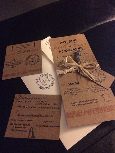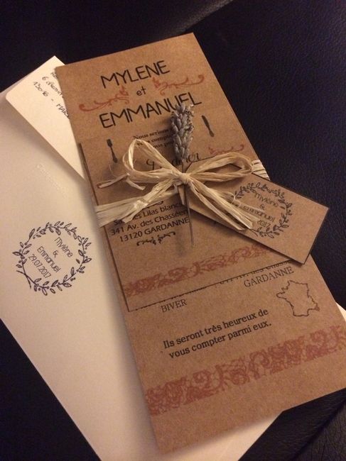 Un vrai travail d'équipe avec mon chéri, les idées, la création, recherche du papier, impression, découpage...et les 70 petits noeuds en raphia !En tout cas, contents du résultat, et des réactions des premiers invités a qui on a pu les donner en main...