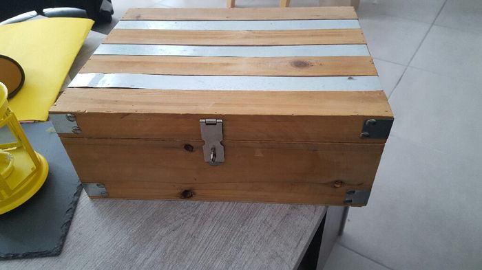 Hello la commu ! J'abandonne mon idée d'urne La Poste car c'est une vraie galère. .. du coup, je suis partie sur un vieux coffre à customiser. Qu en pensez vous ? Mes couleurs sont jaune, blanc et gris (ardoise). Je ne sais pas comment le peindre...