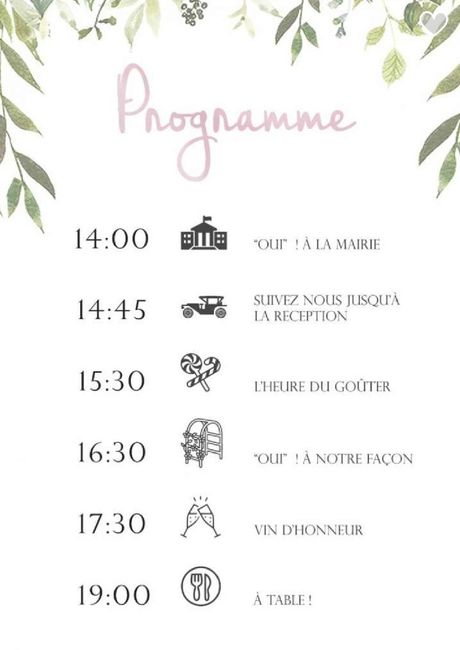 Salut à vous toutes Une petite question et avis sur le déroulement de la journée. Je n'ai pas encore fixé l'heure a la mairie. On voudrait faire mairie , goûter vin d'honneur a la maison, photos puis resto. En sachant que le resto sera a 19h. J' ai...