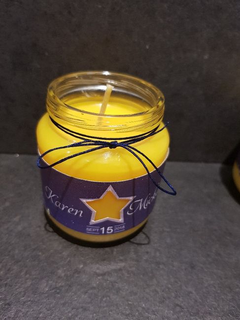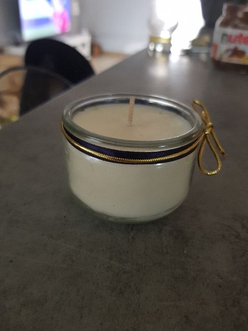 Bonjour les filles ! Nous offrons a nos invités une bougie chacun qui renferme un bracelet pr les femmes et un porte clé ouvre canette pour les hommes. Mon thème est nuit étoilée donc je souhaite faire une bougie or car mes couleurs sont bleu nuit et...