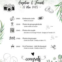 Il y a 358 joursQue pensez-vous de mon programme jour J? Nos photos de couple seront entre nous, en attendant les invités seront à la salle de réception pour se désaltérer