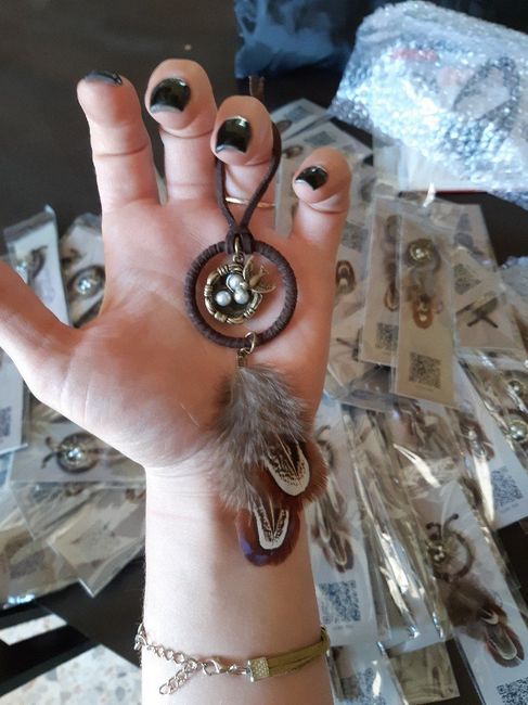 Petits dreamcatchers avec rappel de notre thème oiseaux... Ils seront accrochés aux ronds de serviettes, d'une pierre deux coup ça fait déco et les invités repartiront avec chacun le leur... 😋 Vivement que toute la déco arrive, au fur et à mesure ça...