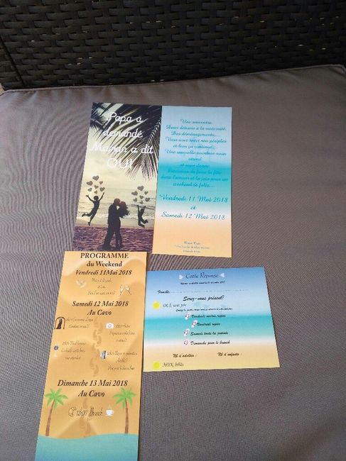 Bonsoir à vous la communauté... Ca y'est les faire parts sont finis, ainsi que le programme du weekend et la carte réponse.... recto verso programme carte réponse