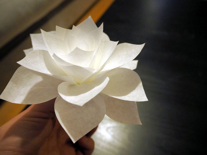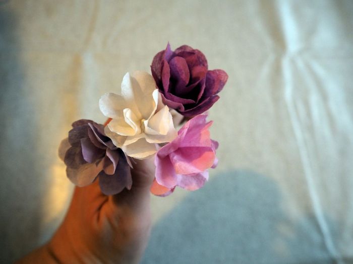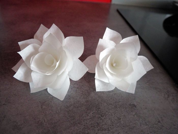 Coucou, Comme vous me l'avez demandé, voici le tuto de mes fleurs blanches Il vous faut 20 pétales comme ceux ci : Avec le premier pétale, enroulez le sur lui même afin de faire le cœur (photo du dessus) Puis collez sur le cœur un deuxième...
