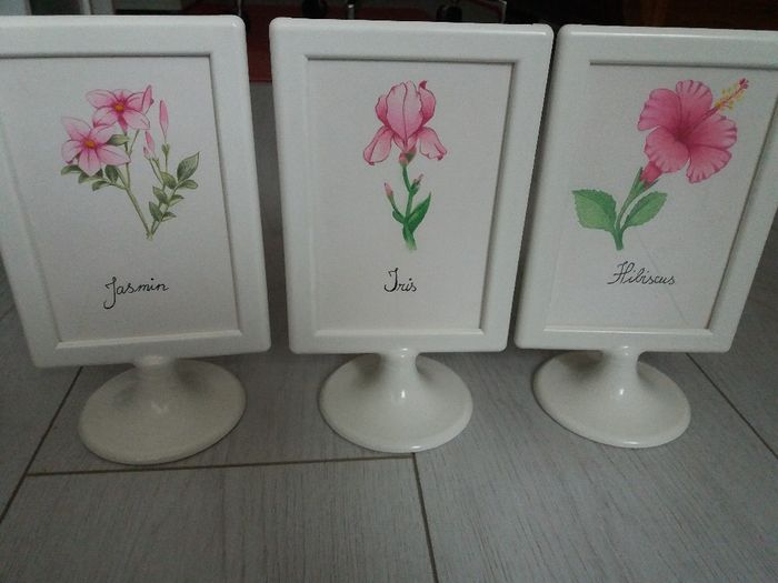 Coucou, Voici mes superbes marques tables dessinés par mon petit frère. Je les adore, ils sont juste magnifiques. Tous ça mis dans un cadre qui a deux faces (Il y a nos menus sur l'autre face). Aller, encore 3 noms et ce sera fini ! Bisous