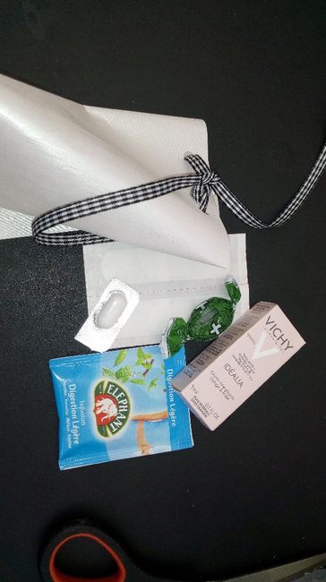 Voilà mon "kit de survie" pour lendemain de mariage que je vais "offrir" à chacun de mes invités J'y ai mis: - une tisane digestion légère - un Doliprane - deux pansements - une crème - un bonbon à la menthe Manque plus que mon autocollants"kit de...