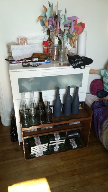 Après deux essais où il me manquait quelque chose... Jai rajouté l étagère chinée mardi dernier et customisée ce matin avec du papier peint imprimé style vieux casiers vintage, et je pense que cette fois c est la bonne ! Ma table urne et livre d or...