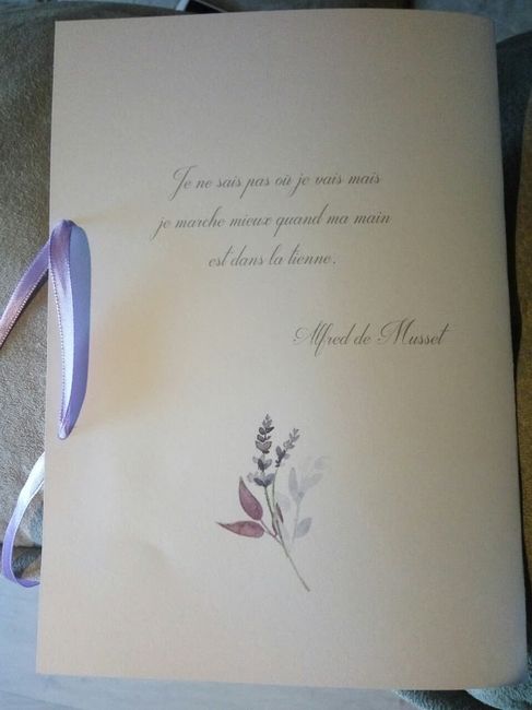 Voilà, après pas mal d'errements, de tâtonnements, j'ai opté pour un livret court.Cela m'a pris pas mal de temps car je ne suis pas une pro du do it yourself, mais le résultat me plait et est assez proche du design des faire-parts (que j'avais...