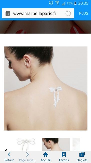 Hello voila en regardant les photo de ma robe je me suis dit qu il manquait quelqud chose dans le.dos alors je me suis dit qu un tatouage efemere ou un bijoux de peux pourrais etre bien sympa