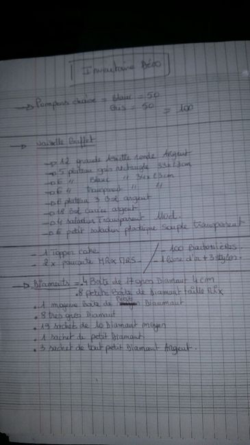 Voila g fait mon premier inventaire deco . sa donne le tourni et il me manque encore pas mal. de plus ma tante ma envoye le debut de mon coussin pour alliance il reste encore de la deco a mettre