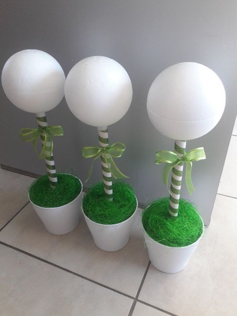 Coucou aujourd'hui nous avons avancé dans la decoration de la table des enfant. Ce matin fabrication en famille des arbres à bonbons puis essaie de la mise en place de la table. Dans les pots de yaourt enveloppé de ballon nous mettrons des gerberas....