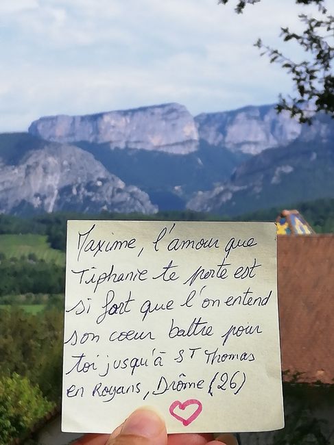 Bonjour à toute. Notre mariage est pour mai 2020 et j'aimerais crié au monde entier à quel point je l'aime pourriez vous m'aider et m'envoyer une photo de votre département, pays ? Avec " Franck je t'aime tellement , que je le cris de ...... ".