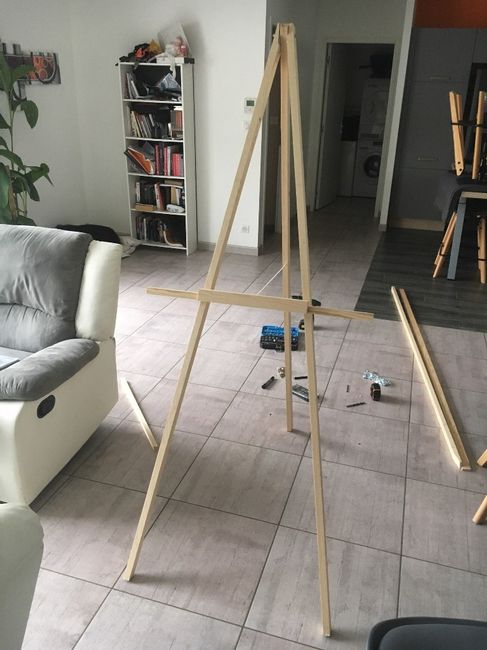 Je voulais 2 chevalets pour notre mariage l'année prochaine ... A l'achat, neuf c est hors de prix et sur le bon coin, ben fallait compter au moins 25€ un. Une amie arrive à en trouver un en prêt ... donc me le file ... couleur bois , très joli . Et...