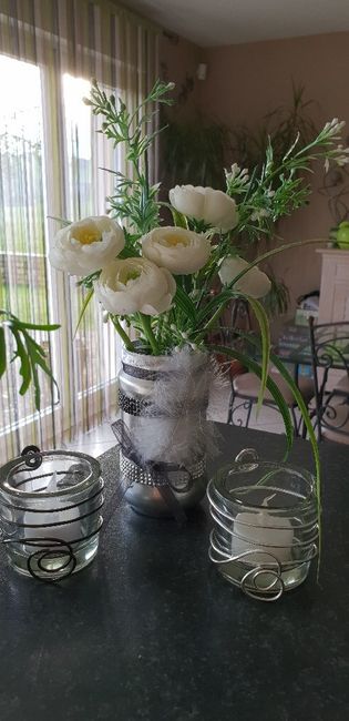 je vous fais partager une partie de mes décos fait mains pour mettre sur la table des invites 😉 le vase est fait avec des pots de confiture 😀 qd on peut recycler autant le faire 😉