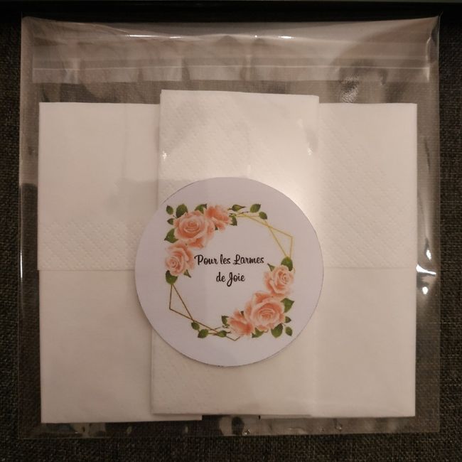 Re coucou, Je ne m’arrête plus aujourd’hui lol Je viens de faire un essai pour les mouchoirs que je compte disposer sur chaque chaise de la cérémonie laïque. Je suis encore en réflexion sur le fait d’en mettre 1 ou 2 par invité.A savoir que le papier...